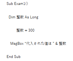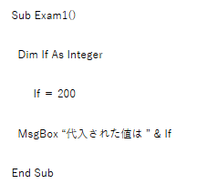 選択肢画像サイズ確認確認用 Access VBA ベーシック 模擬問題 模擬試験 2025.11.292025.12.03 Excel VBA ベーシック 模擬試験 10章 1. __________,__________ VBAでセルを指定する際に使用する用語として、適切ではないものを選択肢から1つ解答しなさい。 Range Cells Cell ActiveCell None 2. __________,__________ 次のマクロの中でエラーとなるものを選択肢から1つ解答しなさい。 None 3. __________,__________ 次のマクロの中でエラーとなるものを選択肢から1つ解答しなさい。 Sub Exam1() Dim 番_号 As Long 番_号 = 200 MsgBox “代入された値は ” & 番_号End Sub Sub Exam1() Dim If As Integer If = 200 MsgBox “代入された値は ” & IfEnd Sub Sub Exam1() Dim 整数 As Long 整数 = 300 MsgBox “代入された値は ” & 整数End Sub Sub Exam1() Dim num1 As Integer num1 = 300 MsgBox “代入された値は ” & num1End Sub None
